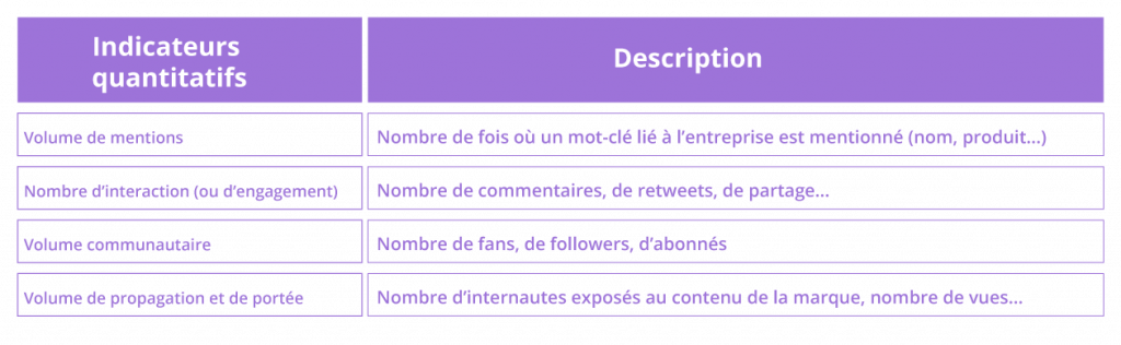 Les outils de veille permettent de rassembler des résultats sur des indicateurs quantitatifs qui permettent d’évaluer l’e-réputation d’une marque :