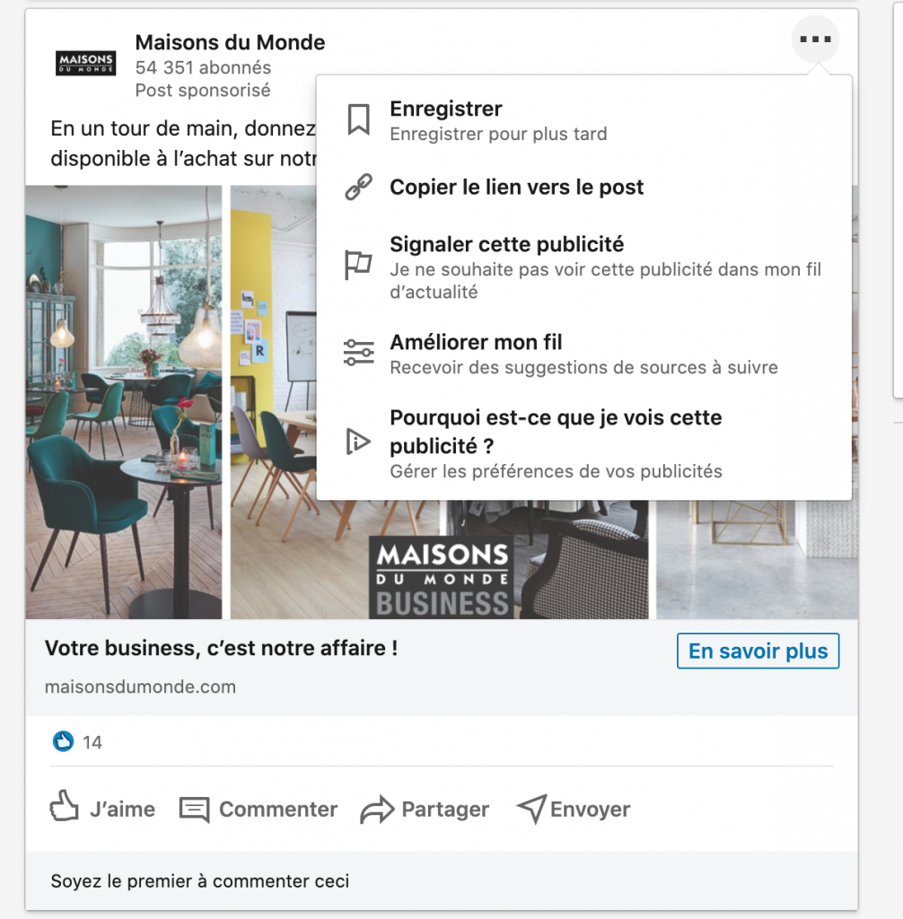 Ouvrez une nouvelle fenêtre dans votre navigateur et accédez à la page de votre entreprise. Cette page est accessible via votre photo de profil (onglet ‘Vous’) dans la barre de navigation. Dans cet exemple (voir illustration), j’ai sélectionné la page Entreprise La Brique Rose