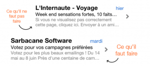 Véritable accroche du mailing, ce texte doit provoquer la curiosité et inciter à l’ouverture et la lecture de l’email. Il doit aussi le rassurer qu’il ne s’agit pas d’un email « spammé ». L’accroche ne doit pas être trop longue – elle serait coupée lors de l’affichage- , ni trop courte – elle serait incompréhensible. 50 signes est une bonne moyenne